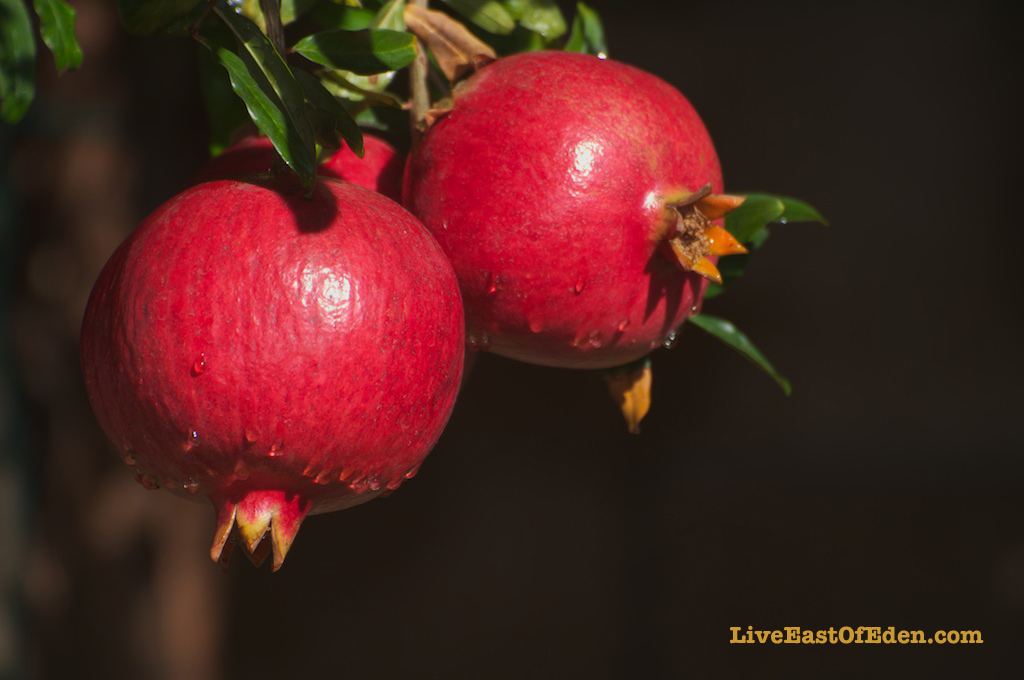From my garden. Some scholars now suggest that it was a pomegranate, and not apple, that led to Adam and Eve’s exodus from the biblical Garden of Eden. It’s only fitting that a girl named Eden would have a forbidden fruit in her garden.